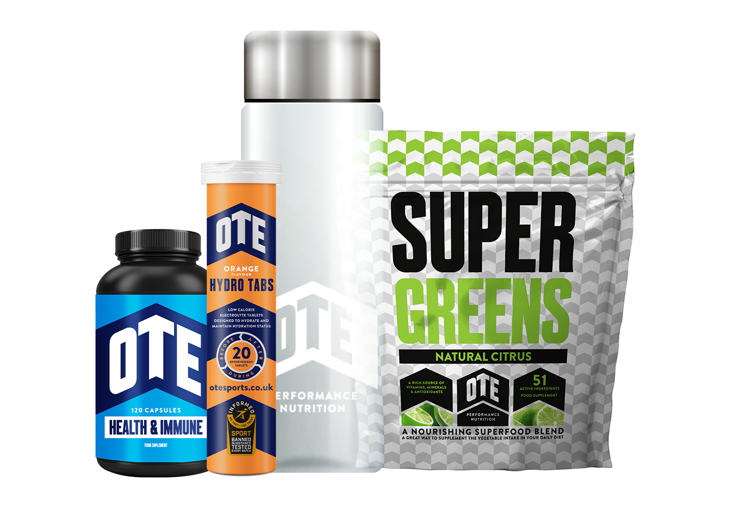 OTE Sports Monthly Supplement Pack with OTE super greens, OTE omega capsules and OTE health and immune capsules